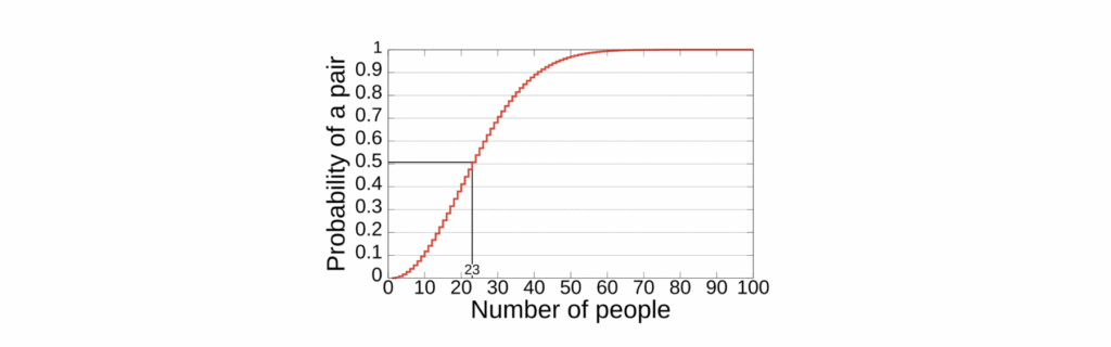 Graph showing the probability of two people sharing a birthday, with the number of people on the X-axis and the probability on the Y-axis, expressed as a percentage.