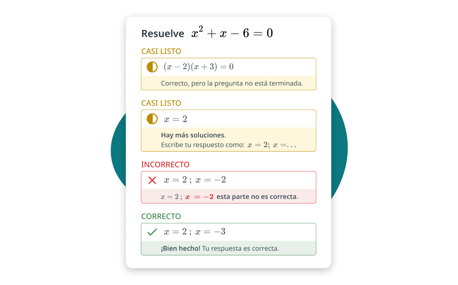 Con WirisQuizzes, puedes ir más allá de una simple respuesta de “correcto” o “incorrecto”, ofreciendo comentarios específicos para expresiones no simplificadas, explicaciones sobre errores comunes o describiendo los pasos de una solución completa para enseñar al alumnado cómo llegar al resultado correcto.