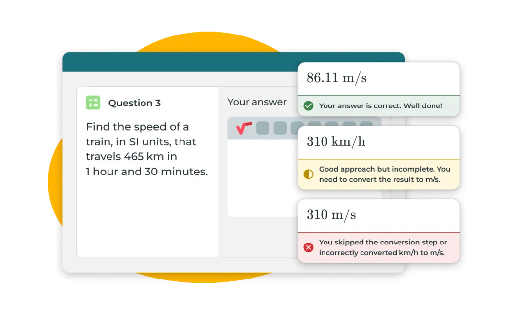 Validate student answers for math equivalence, correct syntax, numerical tolerances, and proper unit handling. You can script custom grading functions for the answers to meet specific conditions.